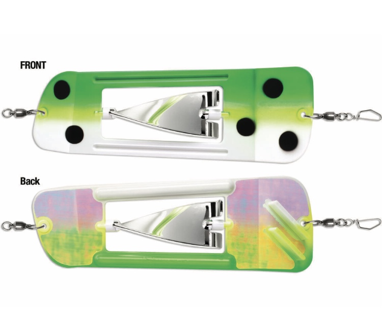 The Coyote Cyclone™ Flasher is an easy pulling, fully rotating flasher. The flasher rolls in a wide elliptical pattern imparting fish attracting flash and motion to your presentation. The center “Cyclone” blade rotates independently adding a strobing flash and vibration. The Kick-Fin design keeps the flasher rolling over a wide range of speeds.